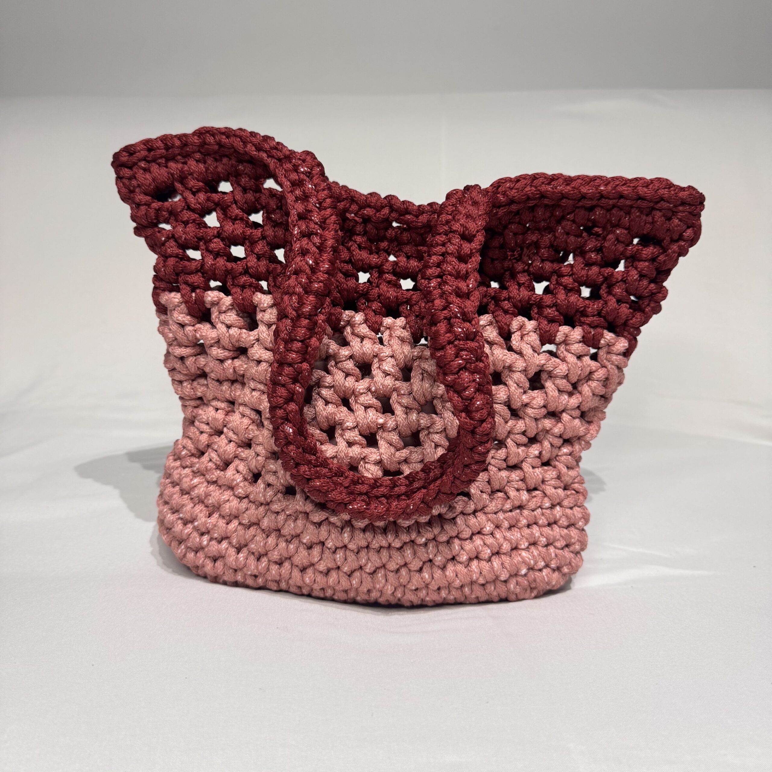 Materiales: trapillo granate y rosa, manija corta, patrón calado, forro (si aplica)