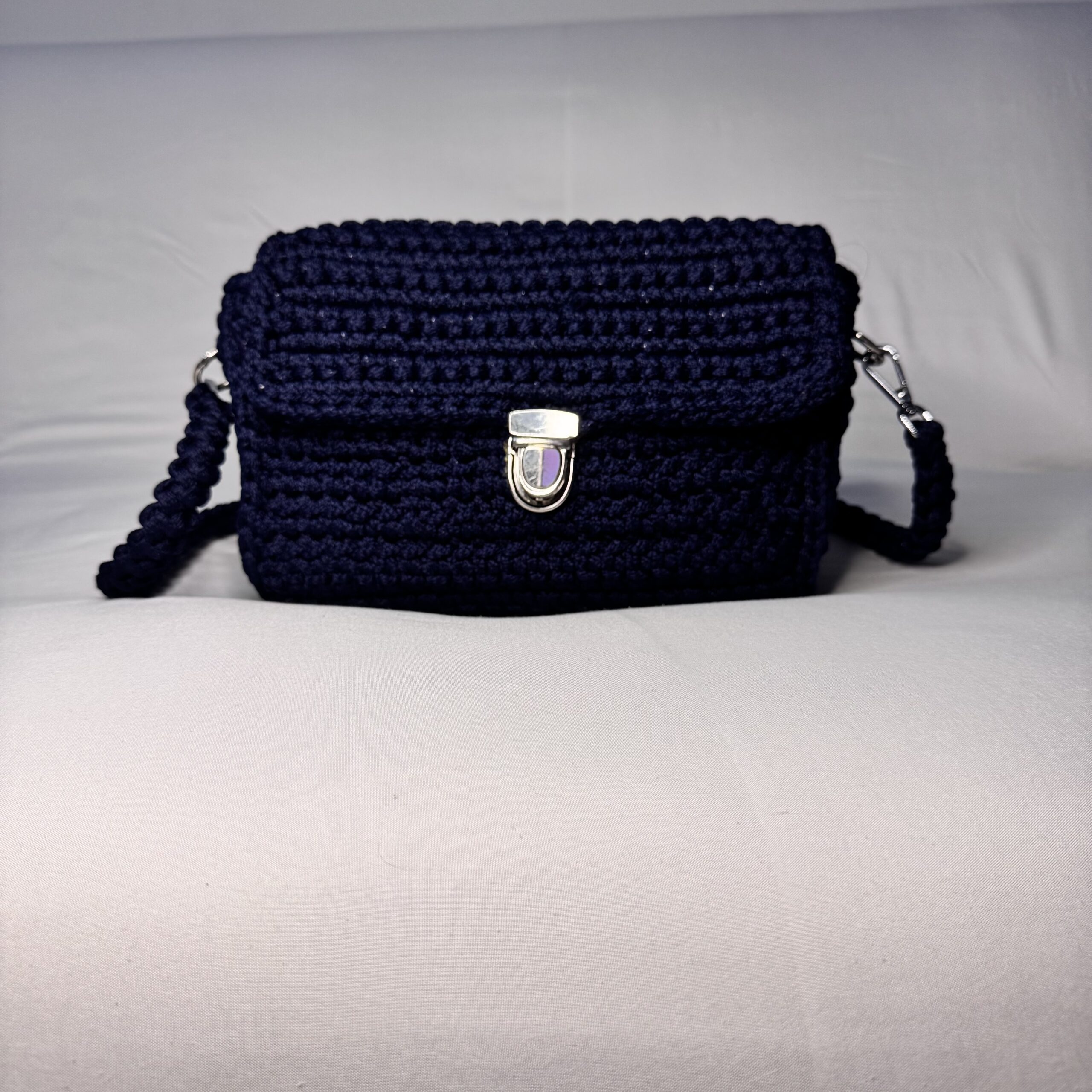 Con líneas definidas y una textura tejida a mano, Nocturno fusiona la elegancia clásica con el arte artesanal. Su cuerpo rectangular en azul marino profundo transmite sofisticación sin esfuerzo, mientras que su broche metálico al frente le añade un cierre seguro y llamativo.